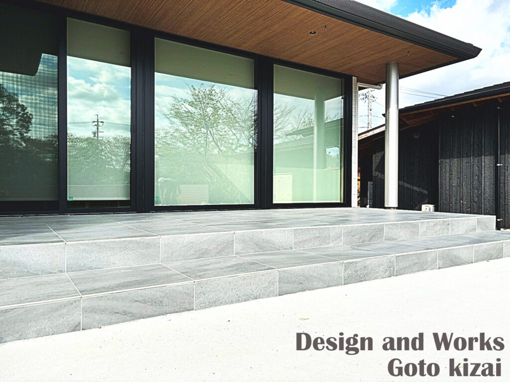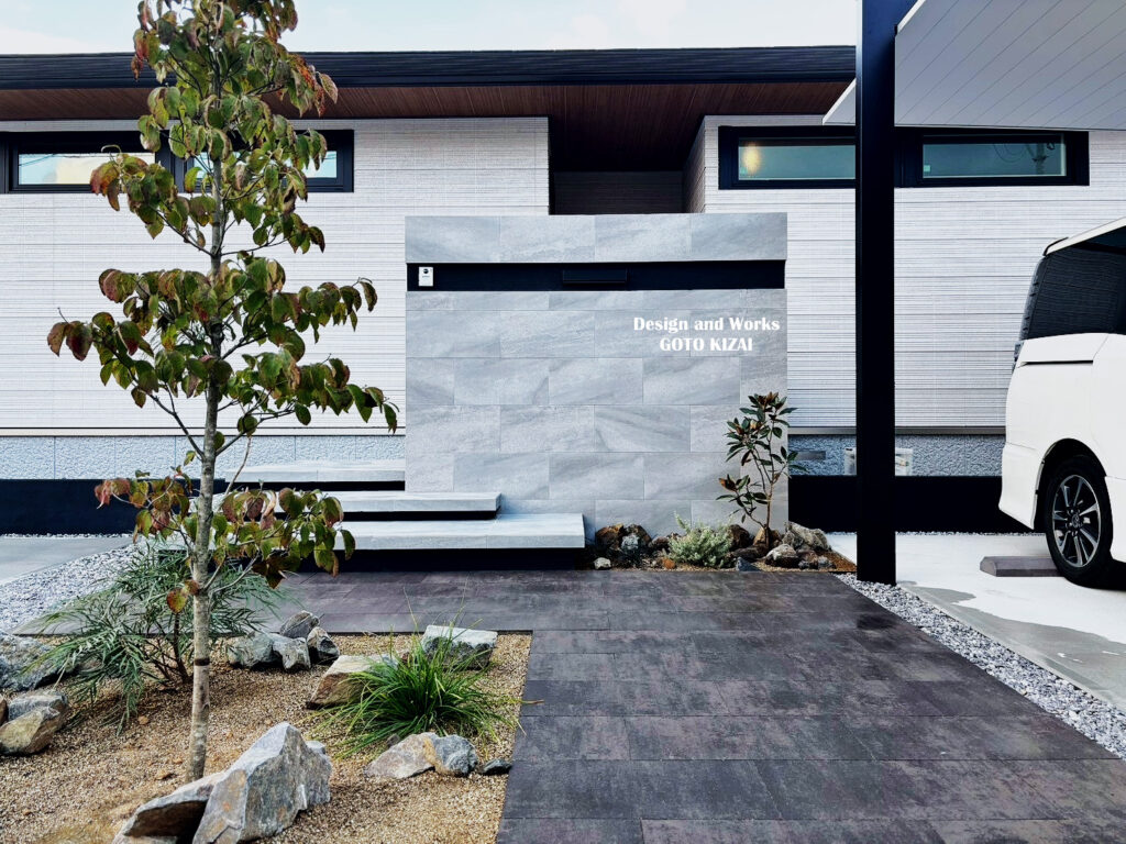 門袖はタイル張りで高級感を演出しつつ、アプローチはダークな色で引き締めました
